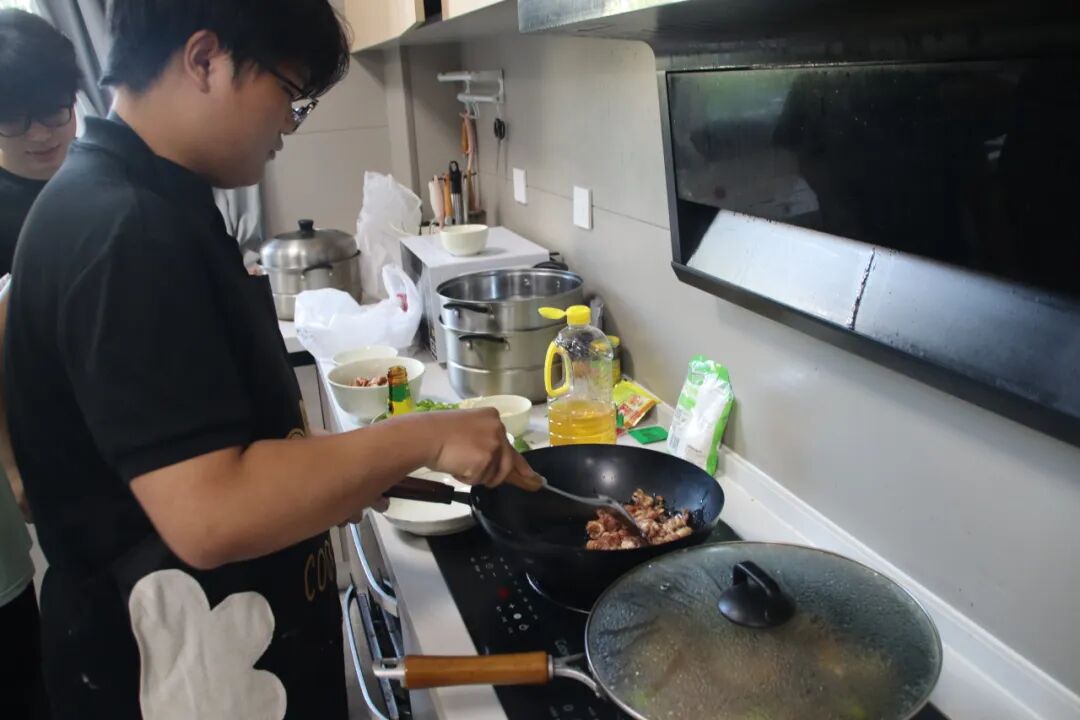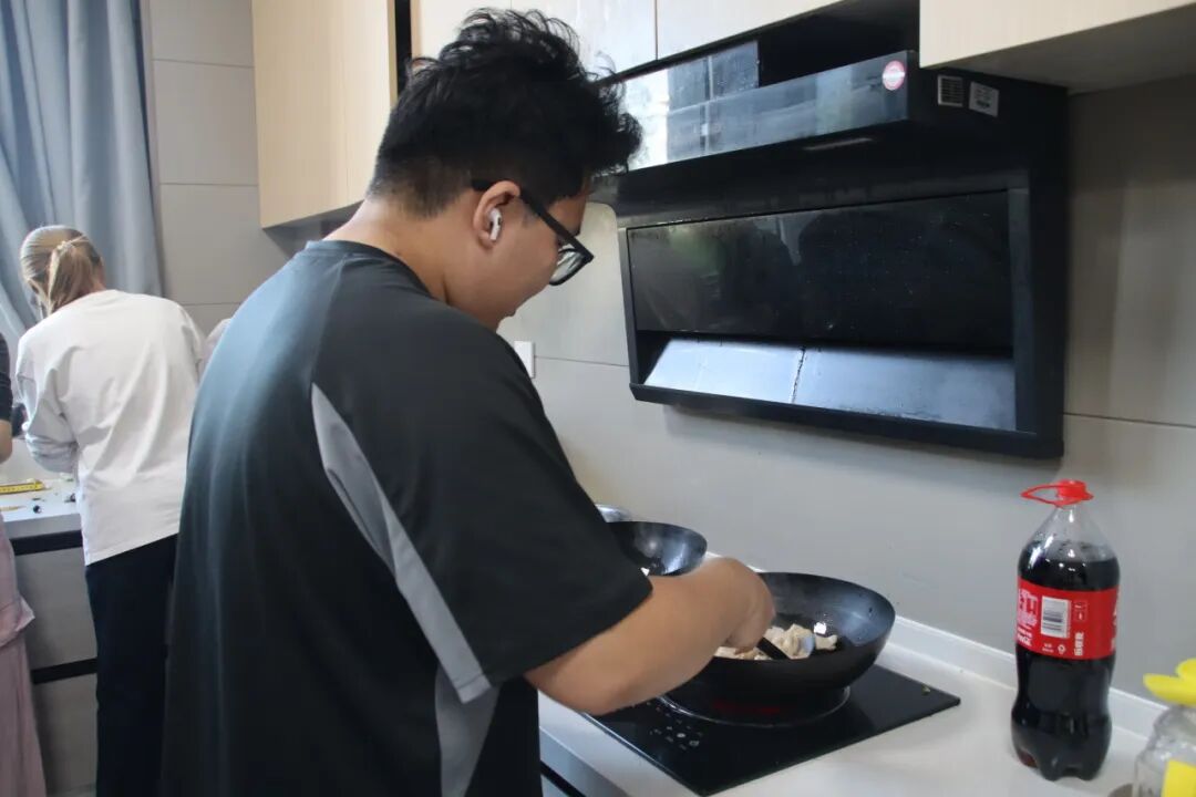 我院师生共同参与备餐、制作环节,气氛融洽。师生们分组协作包饺子,同学们争前恐后露一手,秀刀工、上厨艺,还制作了可乐鸡腿、拌凉菜、鱼香肉丝、青椒炒肉等家常菜,洋溢着“家宴”般的温暖氛围。