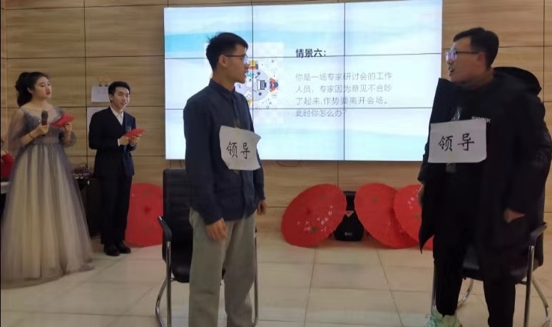比赛第一项,选手们按顺序做关于自己职业愿景、工作经历以及自身优势的ppt讲述,每个选手都展现出了最完美的自己,经历经验都足以让人震撼。比赛进行时,选手们首先通过抽签的方式抽取职场情景问题,由工作人员现场模拟演绎,要求选手直接回答情境相关问题并给出恰当的解决方案。选手们极力发挥,比赛气氛十分紧张,不时让观众们心跳加速。赛程期间还有由主持朗诵团表演的朗诵节目《我的南方北方》,主持人也参与进来,与现场观众进行了几轮职场趣味问答,有效活跃了现场气氛。