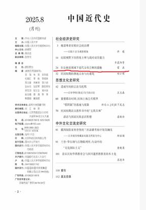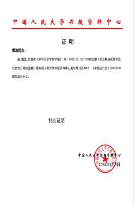 近日,我院吕志茹教授指导的2023级中国史专业研究生雷浪的论文《妇女解放视域下近代女性公厕的滥觞》(载《中华女子学院学报》2025年第3期)被中国人民大学书报资料中心编辑出版的《中国近代史》2025年第8期全文转载。